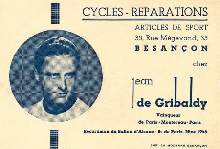 Exploiter sa notoriété régionale de champion en exercice puis d'«ex-Tour de France» pour réussir dans les affaires… Surfer sur ses succès de chef d’équipe et ceux de ses champions… Jean de Gribaldy a toujours su mener de pair ses fonctions au cœur du peloton avec celle de commerçant à Besançon. Dès 1947 déjà, et alors qu'il est toujours en activité dans le peloton professionnel et se prépare à disputer son premier Tour de France l'été qui suivra, Jean a une double casquette. Il est coureur et déjà commerçant à Besançon et ouvre sa première boutique à Besançon, rue Mégevand.