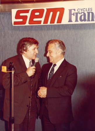 Présentation de l'équipe Sem France-Loire à Paris en 1983, au micro l'animateur, speaker du podium du Tour de France et chansonnier Jean Donguès.