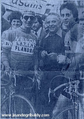 Etoile de Bessèges, 12 février 1977. Jean avec Mariano Martinez vainqueur de la 5e étape, et René Bittinger, second derrière son co-équipier de Flandria.