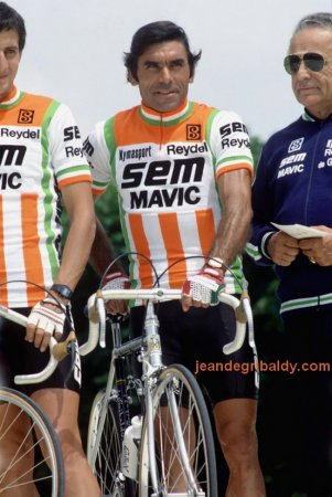Tour de France 1983, 2 juillet, au départ de la première étape entre Nogent sur Marne et Créteil. Jean de Gribaldy avec Joaquim Agostinho, dont ce sera la dernière Grande Boucle, et qui terminera 11e à Paris. Son co-équipier René Bittinger à sa droite abandonnera lors de la 10e étape entre Pau et Luchon, alors que Sean Kelly (7e à Paris) porte alors le maillot jaune.