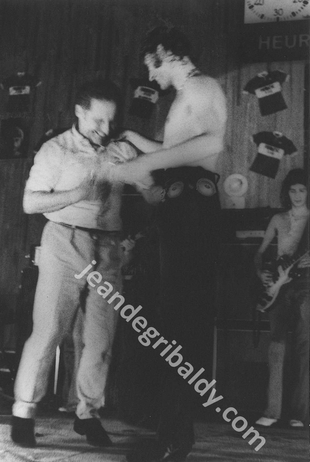 Avec Johnny, sur la scène du Palais des Sports de Besançon, le dimanche 22 septembre 1969. On remarquera les maillots Frimatic de l'équipe cycliste de Jean accrochés au mur et les sourires lumineux et complices.